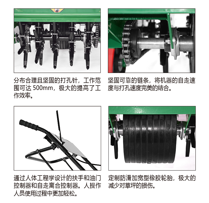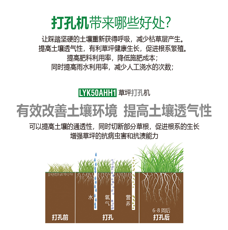 打孔可以切斷部分草根,促進(jìn)根系的生長,增強(qiáng)草坪的抗病蟲害和抗?jié)n能力。