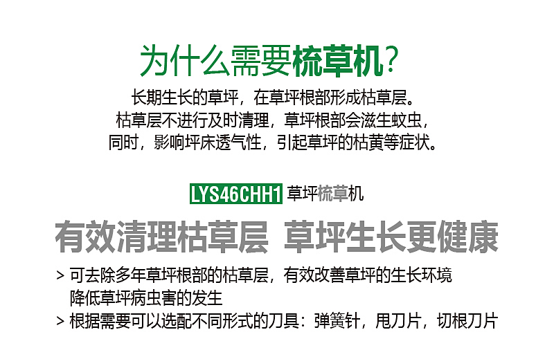 草坪生長一段時間后,底部會結(jié)出一層枯草層,時間一長,不參加光合作用,會霉變腐爛,滋生霉菌,阻礙土壤吸收氧份,導(dǎo)致草坪枯萎,使草坪生長不良,草坪很難看,這時噴灑藥物,不能治本,應(yīng)將枯草清除。梳草機就很省事的能把枯草去除。