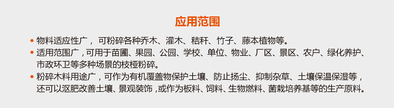 適用范圍廣,可用于苗圃、果園、公園、學(xué)校、單位、物業(yè)、廠區(qū)、景區(qū)、農(nóng)戶、綠化養(yǎng)護(hù)、市政環(huán)衛(wèi)等多種場(chǎng)景枝椏粉碎,最大粉碎直徑10cm。